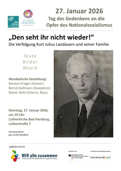 Die Gruppe pax christi Nordharz lädt ein die Lutherkirche zum Holocaustgedenktag. In sorgfältig recherchierten Textcollagen zeichnen die Mitglieder der Gruppe den sich zuspitzenden Verlauf der Verfolgung einer Bad Harzburger Familie im III. Reich nach.  Zwischen den Textabschnitten erklingt Musik für Saxophon, Bass und Klavier.
